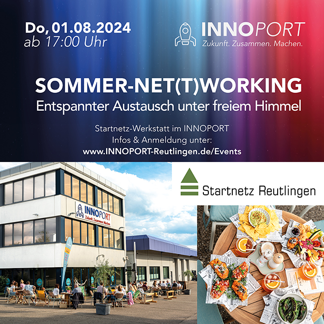 Das Sommer-Net(t)Working findet am Donnerstag, den 1. August 2024, ab 17 Uhr bis open end im INNOPORT Reutlingen statt. Nutzt die Gelegenheit, bei schönem Wetter unter freiem Himmel in entspannter Atmosphäre neue Kontakte zu knüpfen und bestehende zu pflegen. Als kleines Dankeschön erhalten alle Gäste, die sich anmelden, ein Gratis-Getränk.