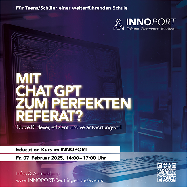 Kann KI dir bei deinem nächsten Referat helfen? Erfahre in diesem Workshop, wie du Tools wie ChatGPT sinnvoll einsetzt, worauf du achten solltest, wie du KI als Unterstützung nutzen kannst und dabei trotzdem kreativ und eigenständig bleibst.