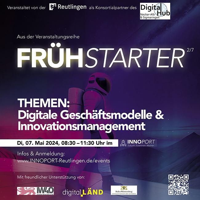 Als Teil des Digital Hub hat die neue Veranstaltungsreihe FRÜHSTARTER das zentrale Ziel, regionale Innovationskraft zu stärken und den Wissenstransfer zu Zukunftstechnologien im Bereich der Digitalisierung zu erhöhen. Es sind Veranstaltungen im INNOPORT Reutlingen zu Themen rund um die Digitalisierung (KI, Robotics, Innovationsmanagement, IT-Automatisierung u.v.m.) geplant.