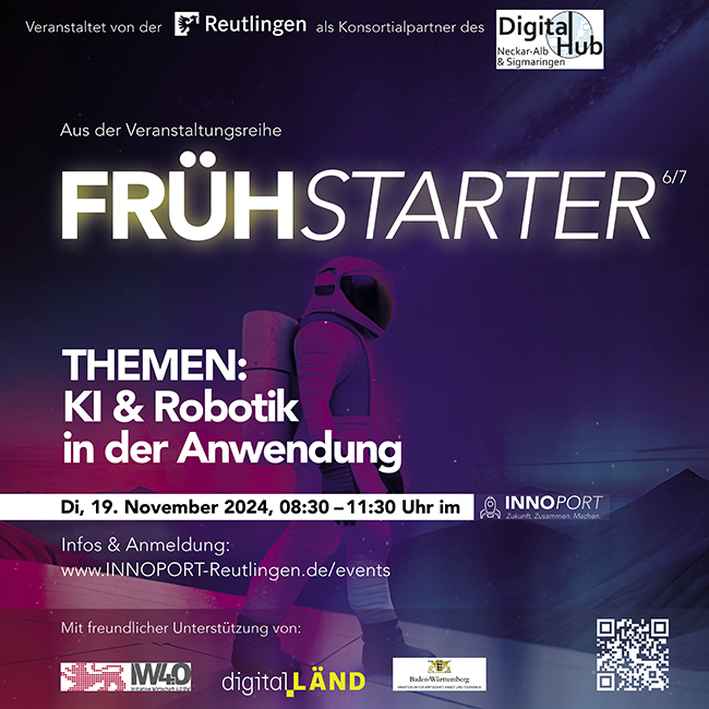 Als Teil des Digital Hub hat die Veranstaltungsreihe FRÜHSTARTER das zentrale Ziel, regionale Innovationskraft zu stärken und den Wissenstransfer zu Zukunftstechnologien im Bereich der Digitalisierung zu erhöhen. Es sind Veranstaltungen im INNOPORT Reutlingen zu Themen rund um die Digitalisierung (KI, Robotics, Innovationsmanagement, IT-Automatisierung u.v.m.) geplant. Dieses mal geht es um die Themen KI & Robotic.