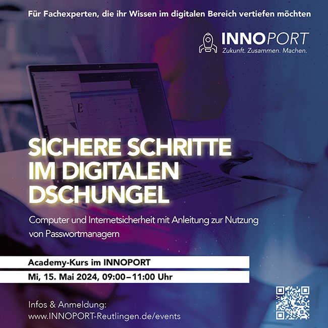 Sollten Sie an diesem Termin verhindert sein, aber prinzipiell Interesse an dem Kurs haben, setzen Sie sich gerne mit Hannah Meixner (h.meixner@innoport-reutlingen.de) in Verbindung und geben Ihre Themenwünsche mit in die Auswahl für zukünftige Termine.